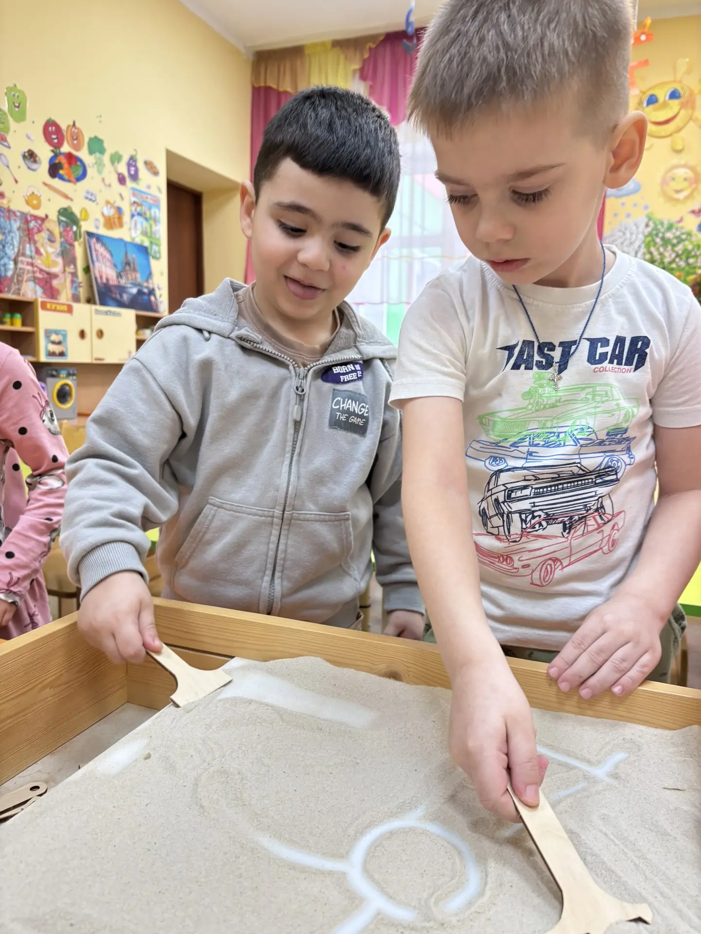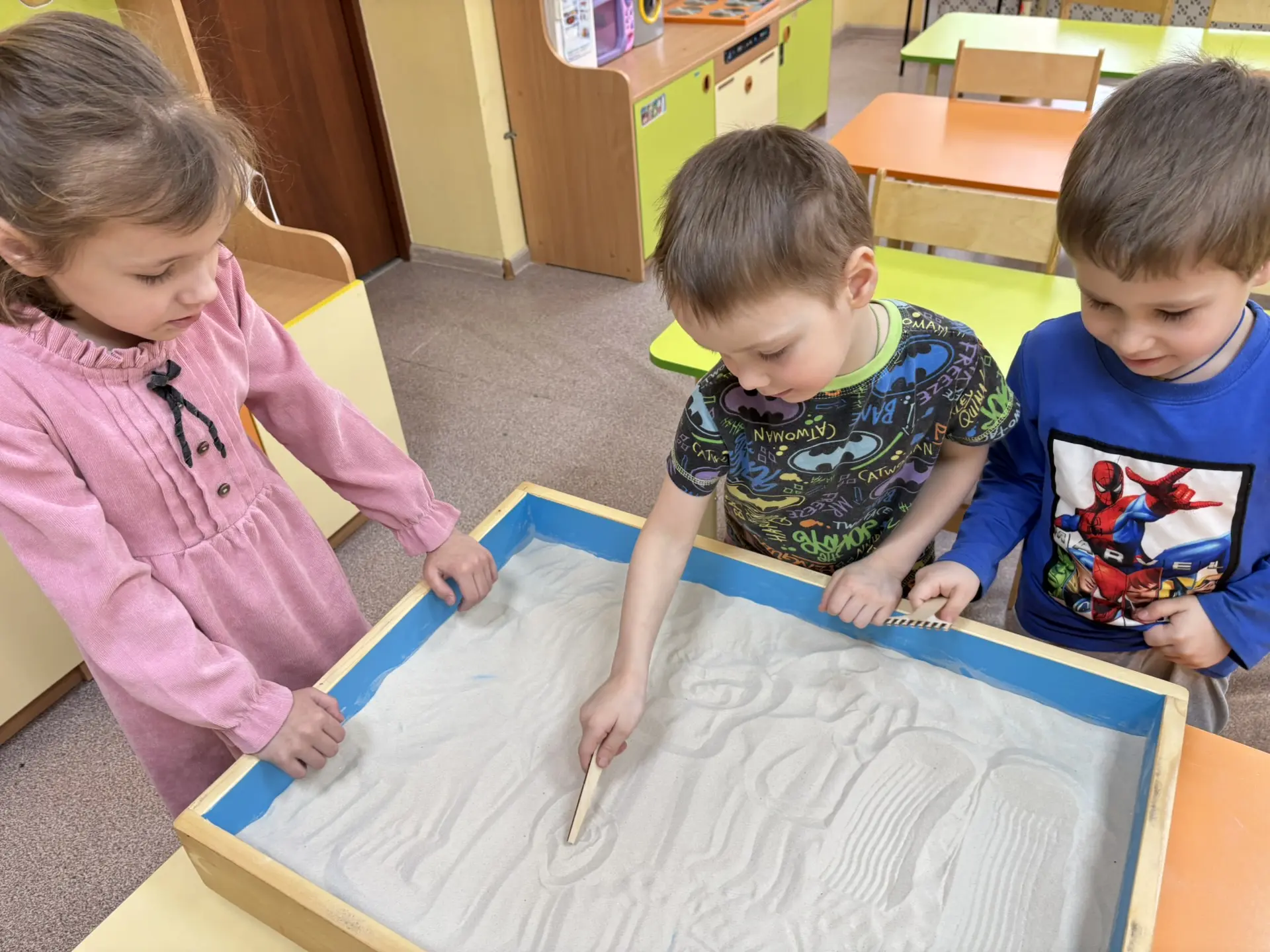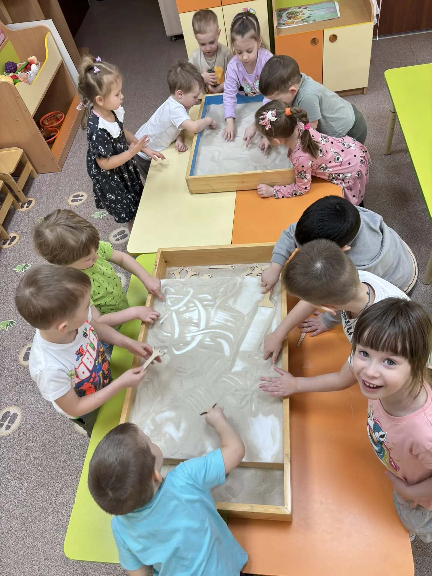 В рамках реализации проекта «Предшкола: стандарт детского сада» на тематической неделе «Инновационные технологии и практики” в средней группе №20 прошло занятие “Рисование песком”. Дети учились работать с сыпучим материалом, передавать форму, строение предмета и его частей, используя разные отенки света и тени. Так же развивали восприятия, внимания, памяти, мышления, учились рисованию кулаком, ладонью, ребром большого пальца, щепотью, мизинцами, несколькими пальцами одновременно. Воспитатели: Цуркан Т.И., Сидорчук Т.В..