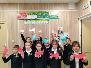 27.10-31.10.2025. В рамках тематической недели ” Творческая мастерская: творчество и коммуникация ” ученики эффективной начальной школы готовились к празднованию Дня народного единства. Для этого ребята вырезали голубей, причем белого, синего и красного цветов. Голубь как символ мира на земле. Ребята с большой ответственностью подошли к подготовке предстоящего праздника. По окончанию творческой мастерской сделали флешмоб.